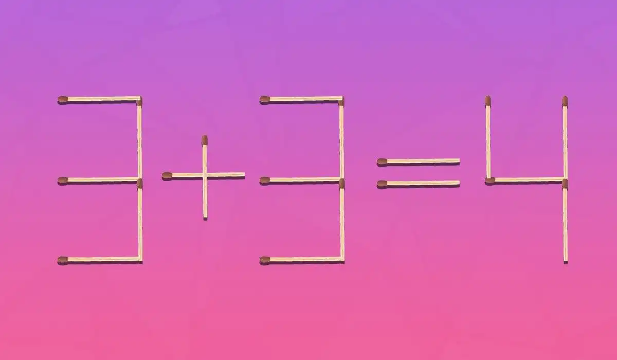 Poniżej znajduje się obrazek, na którym równość 3+3=4 jest ułożona z zapałek. Z matematycznego punktu widzenia jest to nieprawidłowe, ponieważ odpowiedzią powinno być sześć.